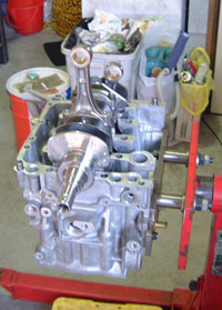 ブロック合わせ面のノックピンがしっかり挿しこまれているのと、同じく合わせ面に液状ガスケットが塗られているので、念のため結合ボルトを2本くらい仮締めしてエンジン台から外し、ブロックに傷がつかないようにダンボールやウエスを敷き詰めた地べたに降ろします。